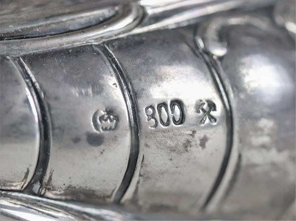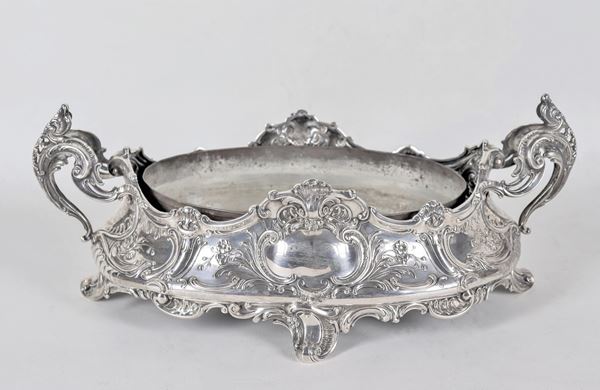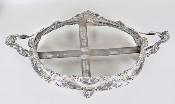 Centrotavola ovale porta fiori in argento, interamente cesellato e sbalzato a motivi Luigi XV, sorretto da quattro piedini ricurvi, gr. 760