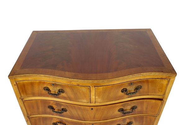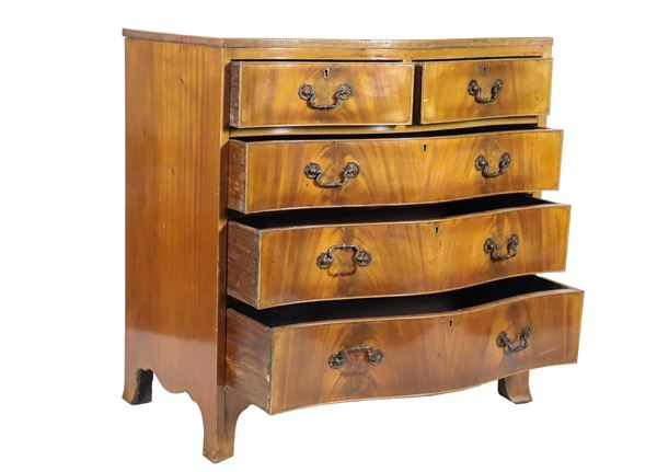 Comò inglese Epoca Edoardo VII in mogano e piuma di mogano, a forma leggermente centinata con cinque tiretti