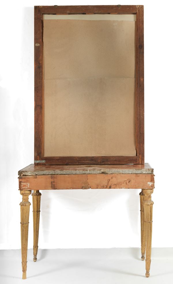 Da restaurare. Consolle cm 112 x 56 x 90 h, specchiera cm 101 x 146 h.