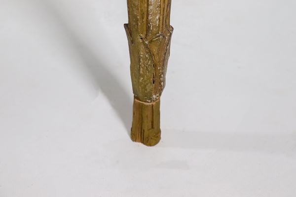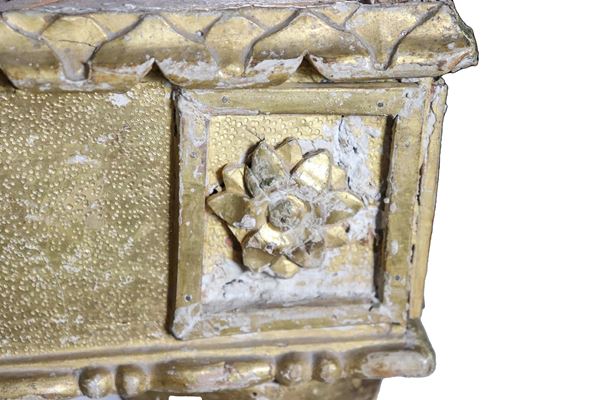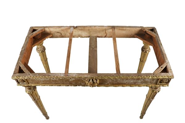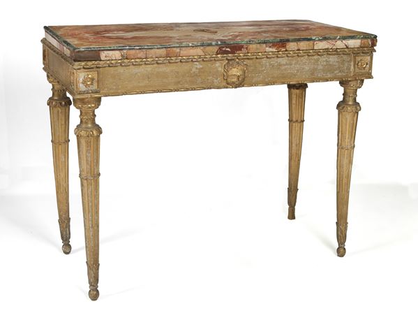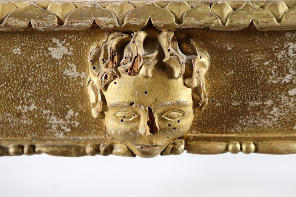 Consolle romana Luigi XVI con specchiera, in legno dorato e intagliato a motivi di mascheroni e rosoni, gambe a colonne rastremate e piano in [..]