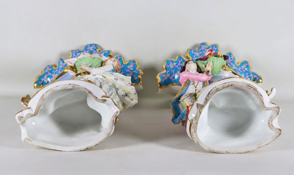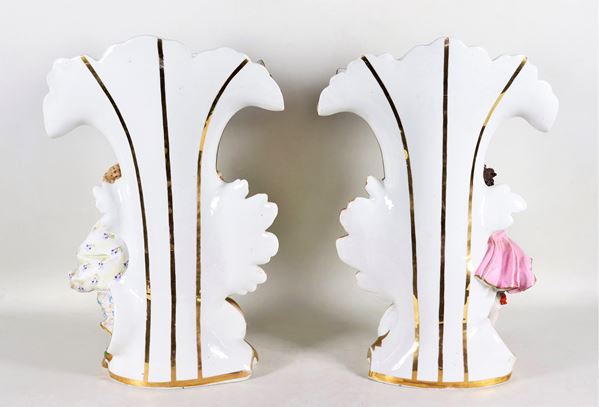 Coppia di antichi vasi "a cartoccio" Luigi Filippo in porcellana, con sculture a rilievo "Dama e cavaliere", al centro medaglioni dipinti a [..]