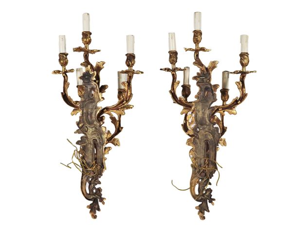 Coppia di appliques francesi in bronzo dorato e cesellato a motivi Luigi XV, 5 luci ciascuna