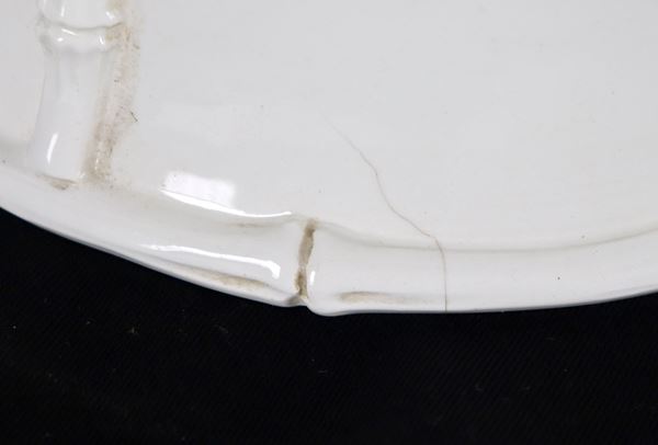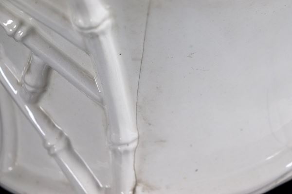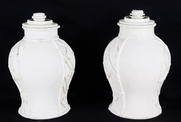 Coppia di lampade a forma di potiches in ceramica porcellanata e smaltata bianca, con decorazioni a rilievo a motivo Bamboo