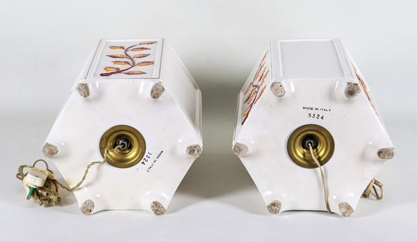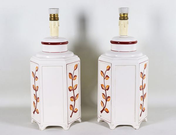 Coppia di lampade da tavolo esagonali, in ceramica smaltata bianca con foglie a rilievo marroni e gialle