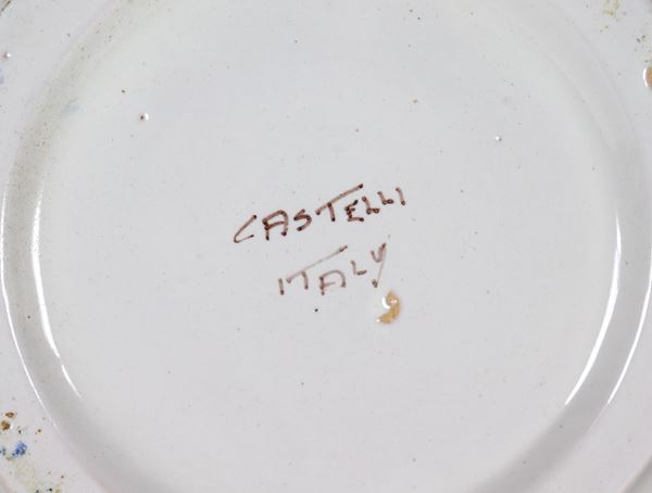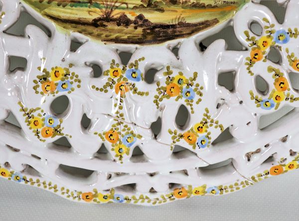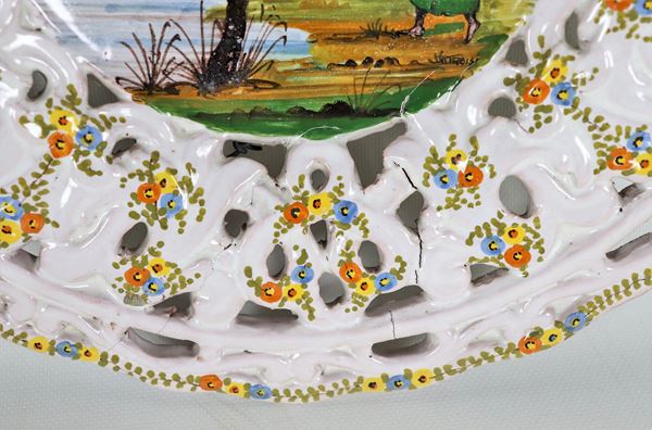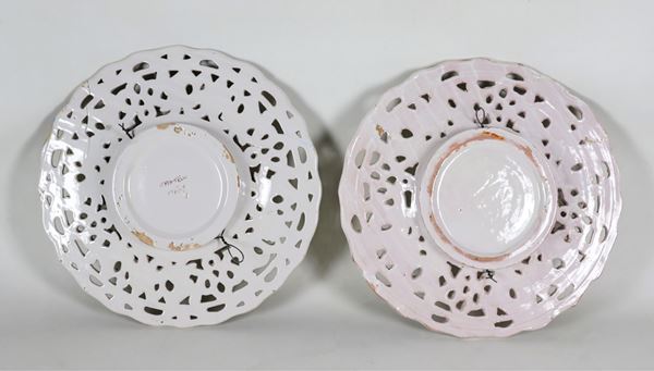 Coppia di piatti da muro in maiolica smaltata e porcellanata di Castelli, con bordi traforati e scene di paesaggi con contadine al centro