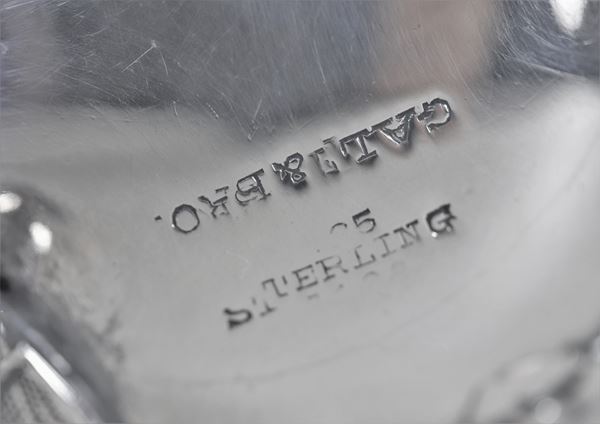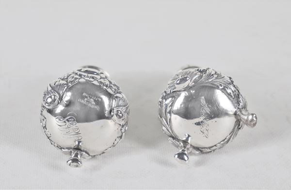 Coppia di sale e pepe in argento Sterling 925, interamente cesellati e sbalzati a mazzetti di fiori e foglie, sorretti da tre piedini ricurvi [..]