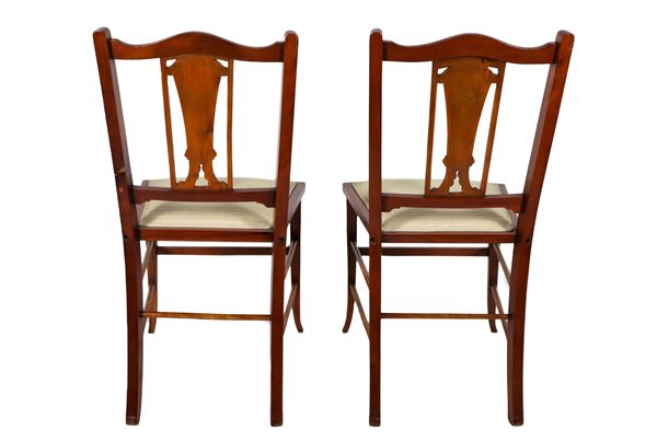 Coppia di sedie in noce con schienali traforati ed intarsiati in legno satinato e avorio, a motivi di fiocchi e calatine floreali