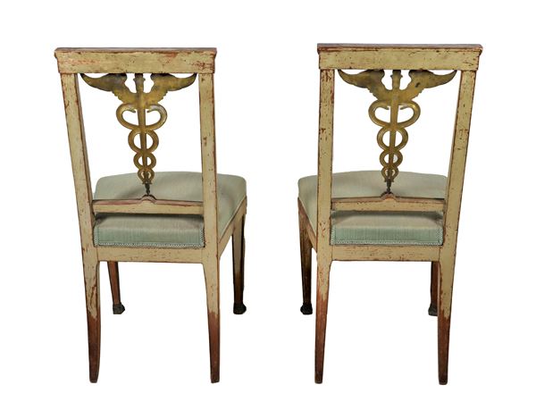 Coppia di sedie Primo Impero in legno dorato e laccato avorio, con al centro degli schienali "Il Caduceo di Mercurio"