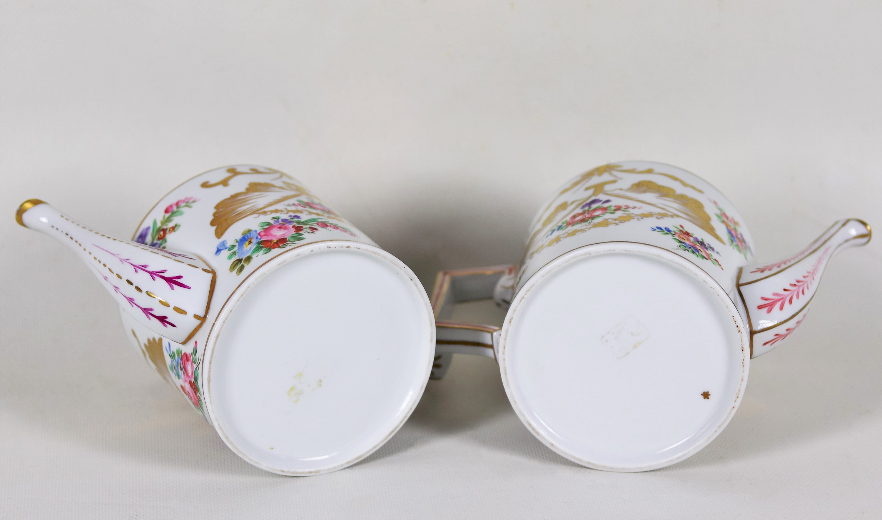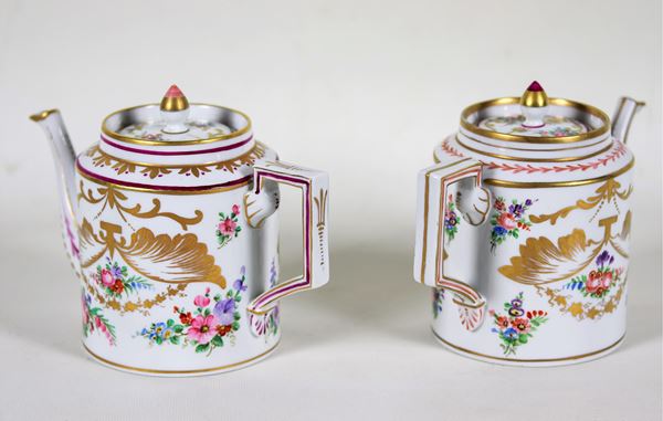 Coppia di teiere francesi in porcellana bianca, interamente decorate e variopinte a motivi di mazzetti di fiori, lumeggiature in oro zecchino [..]