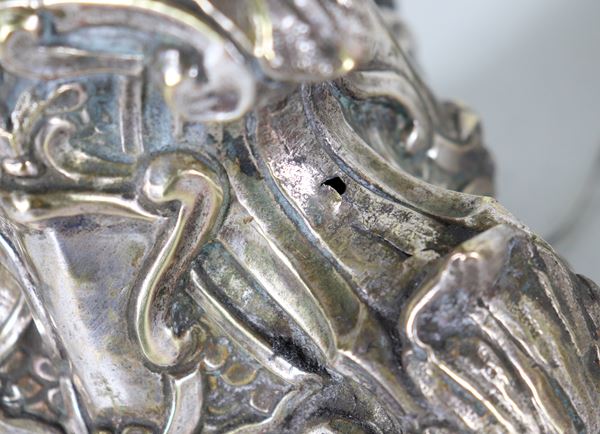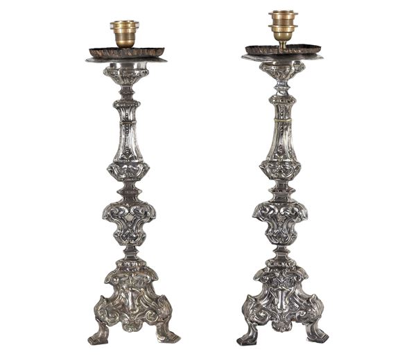 Coppia di torcieri da tavolo in rame argentato, cesellato e sbalzato a motivi Luigi XIV
