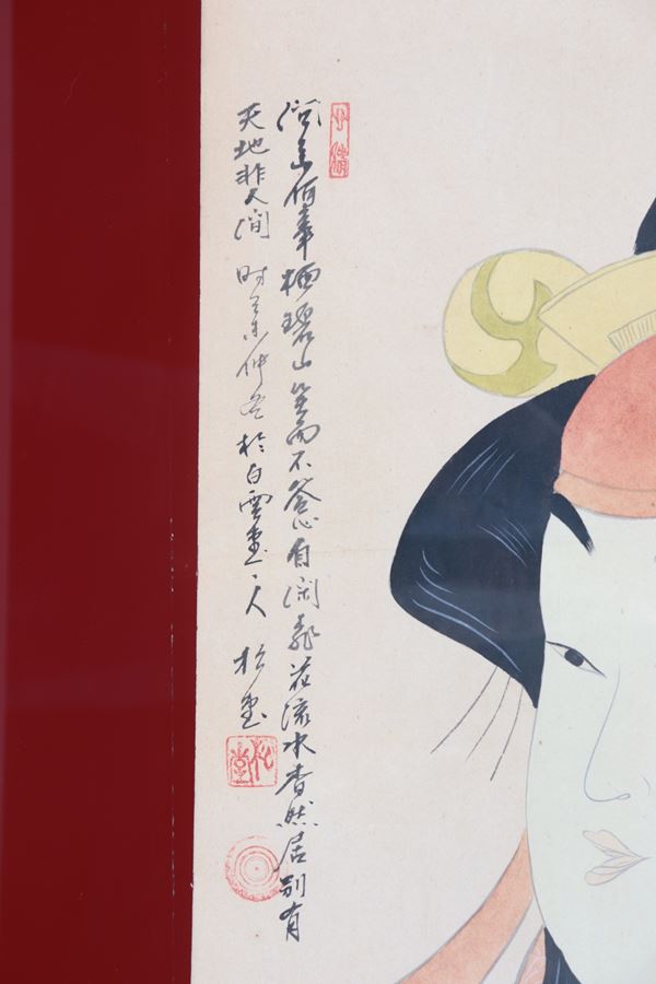 "Cortigiana imperiale", antico disegno giapponese acquarellato su carta di riso, con iscrizioni e firma