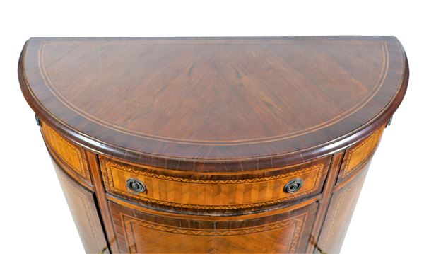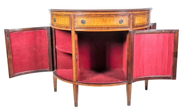 Credenza napoletana a mezza luna di linea Luigi XVI, in ebano viola, bois de rose e mogano, con intarsi a motivi geometrici