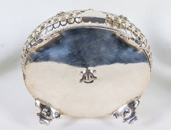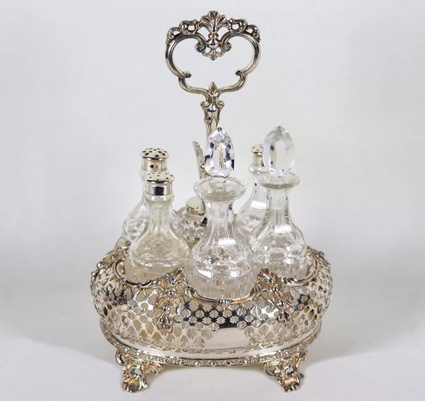 Cruet inglese Giorgio IV in Sheffield cesellato, sbalzato e traforato a motivi di volute e conchiglie, sorretta da quattro piedini ricurvi, [..]