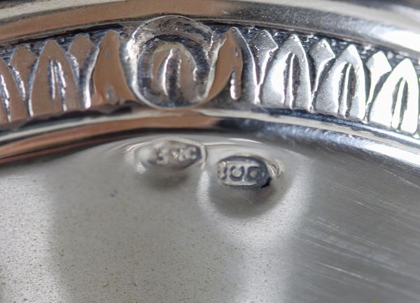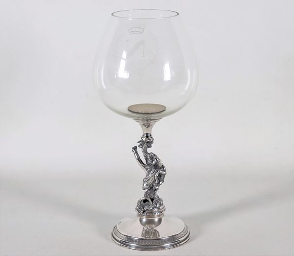 Grande bicchiere da cognac in cristallo, sorretto da scultura in argento di "Putto con grappoli d'uva", gr. 500
