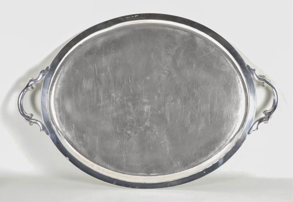 Grande vassoio francese ovale a due manici, in metallo argentato e sbalzato con fondo cesellato a volute floreali e conchiglie e monogramma [..]
