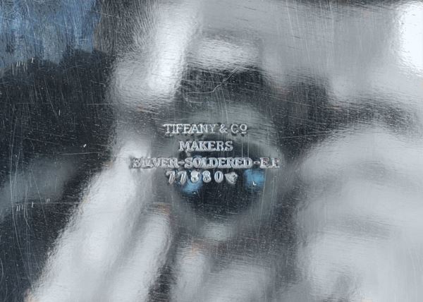 Grande vassoio rettangolare a due manici Tiffany & Co Makers Silver- Soldered EP, in metallo bagnato in argento, cesellato e sbalzato a motivi [..]