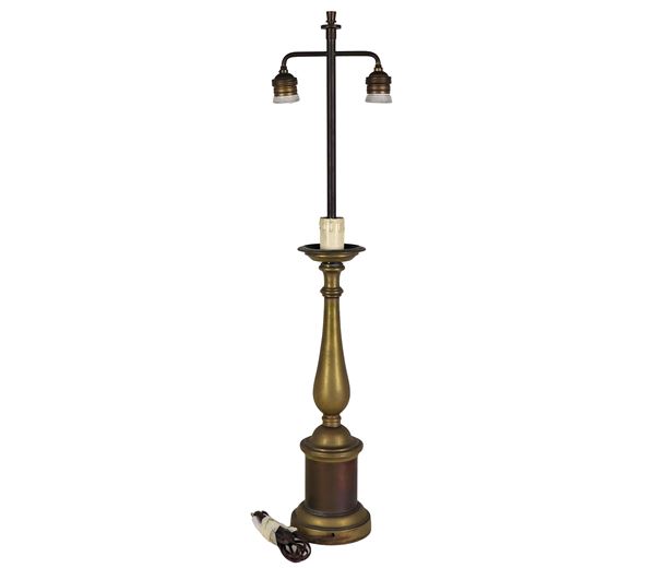 Lampada da tavolo a forma di colonna tornita in bronzo patinato, 2 luci