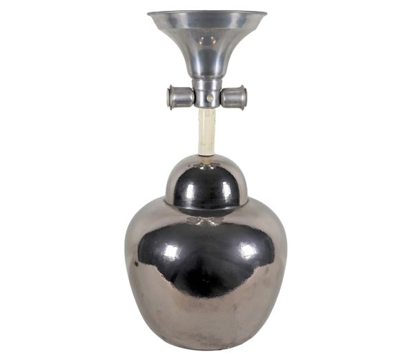 Lampada da tavolo in ceramica argentata, con decorazione a rilievo di fiore dorato