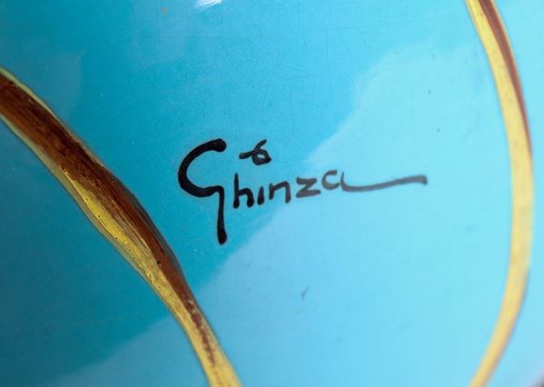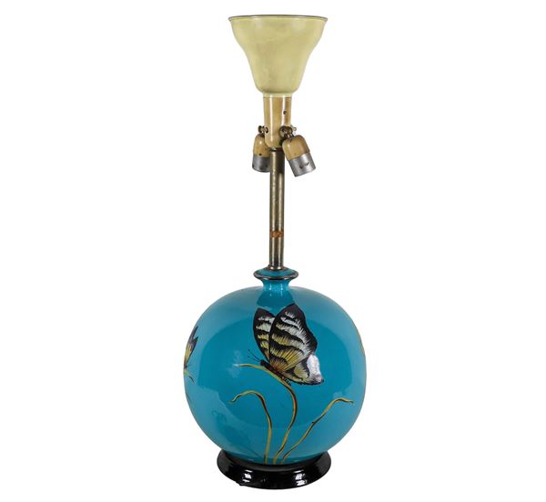 Lampada da tavolo in ceramica celeste porcellanata e smaltata, con decorazioni in smalto a rilievo a motivi di farfalle