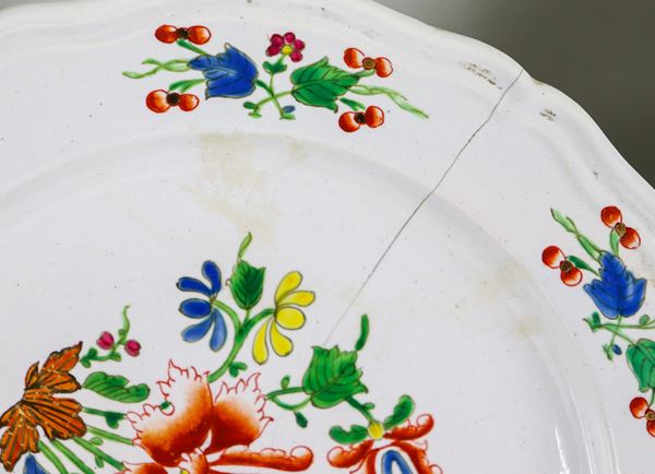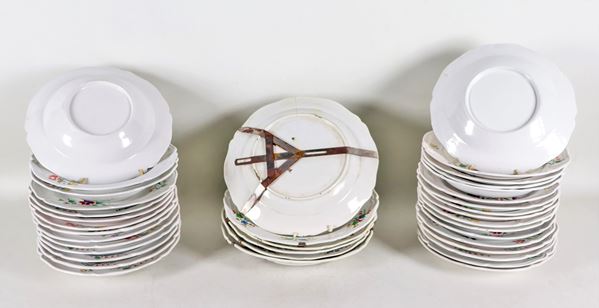 Lotto di 37 piatti in maiolica italiana porcellanata, con decorazioni in smalto a motivi di mazzetti di fiori