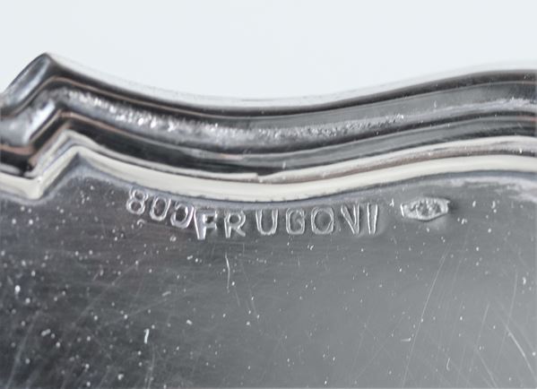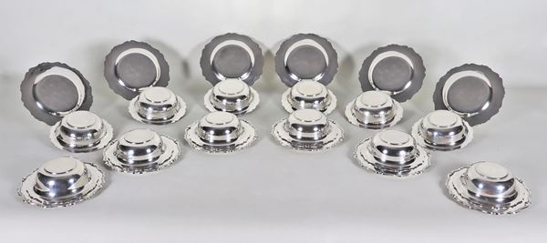 Lotto di dodici coppe con piattini in argento, con bordi centinati, cesellati e sbalzati (24 pz), gr. 2600