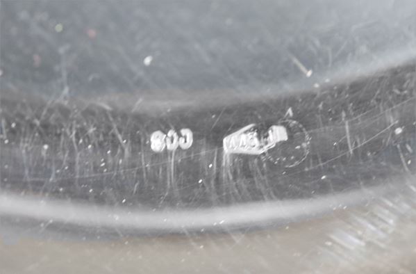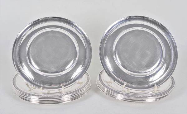 Lotto di dodici piattini per il pane in argento, con bordi cesellati a palmette neoclassiche e monogramma inciso, gr. 1250
