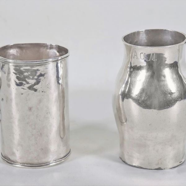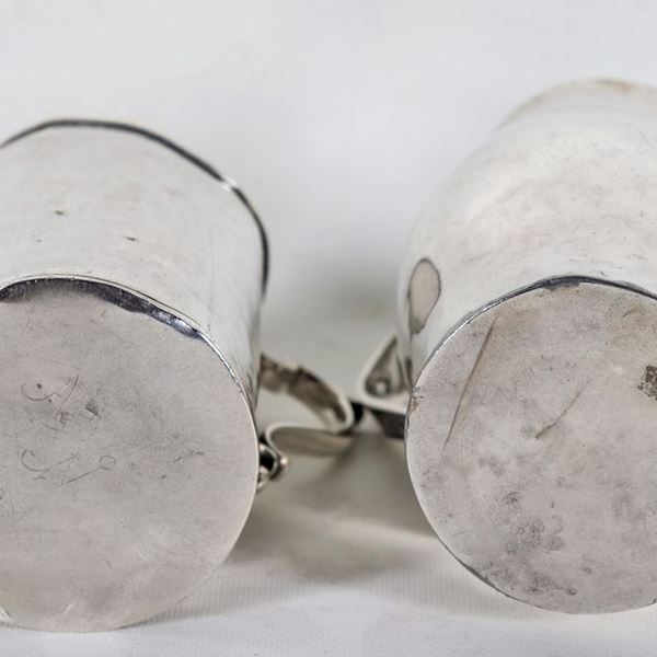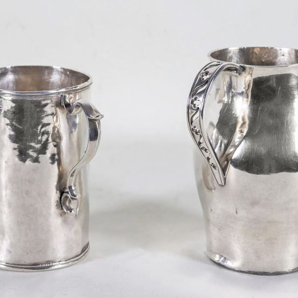 Lotto di due antichi boccali sudamericani in argento martellato, gr. 800