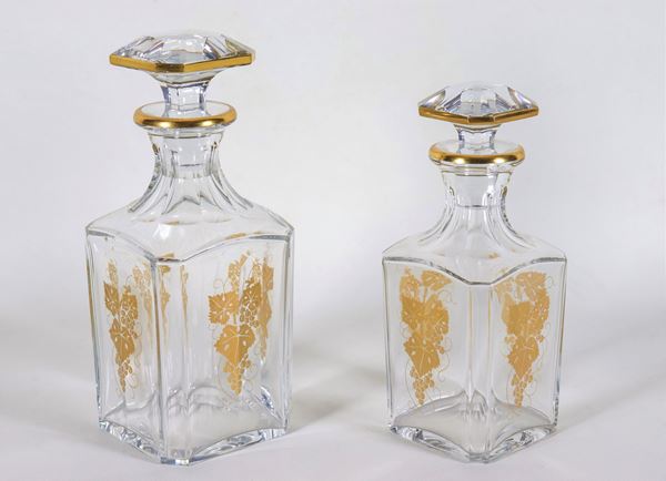 Lotto di due bottiglie quadrate in mezzo cristallo con decorazioni dorate di grappoli d'uva