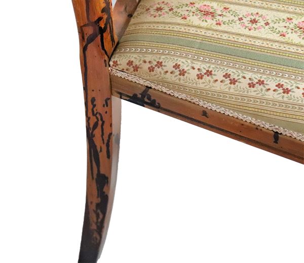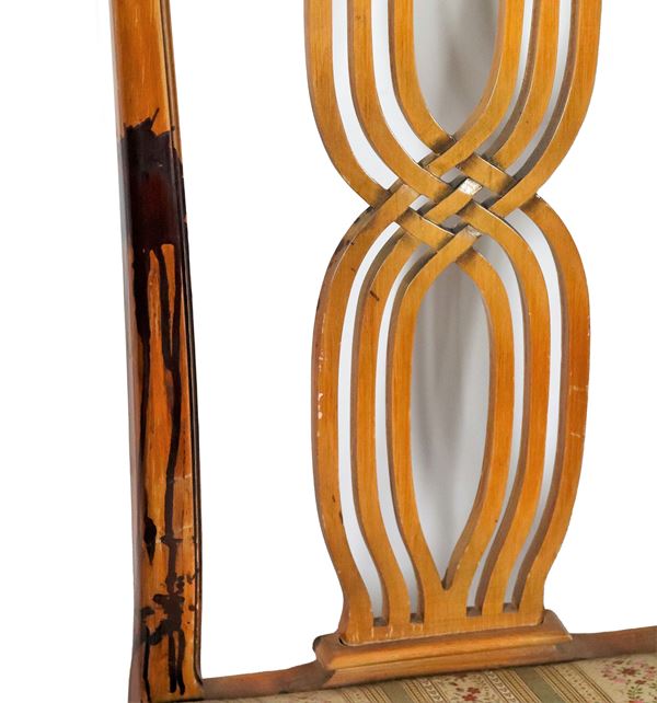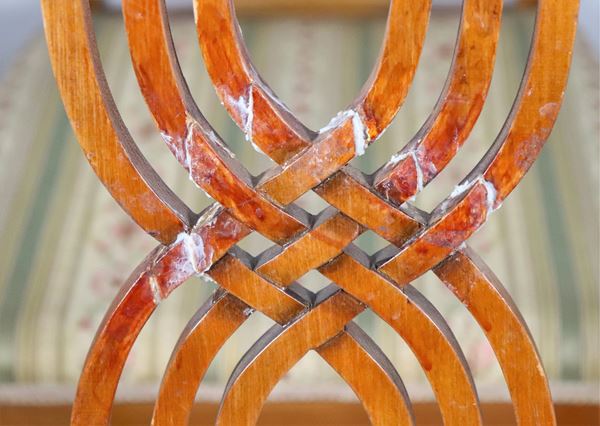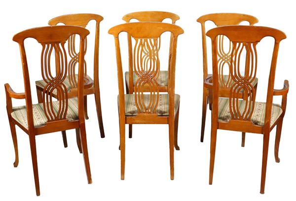 Lotto di due poltrone capotavola e quattro sedie in mogano chiaro, con schienali intrecciati e gambe a sciabola, copertura in tessuto fiorato [..]