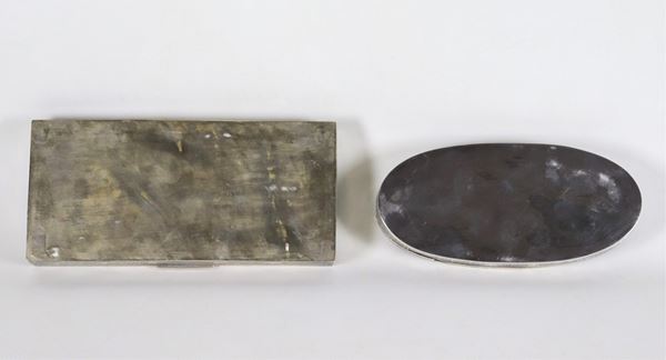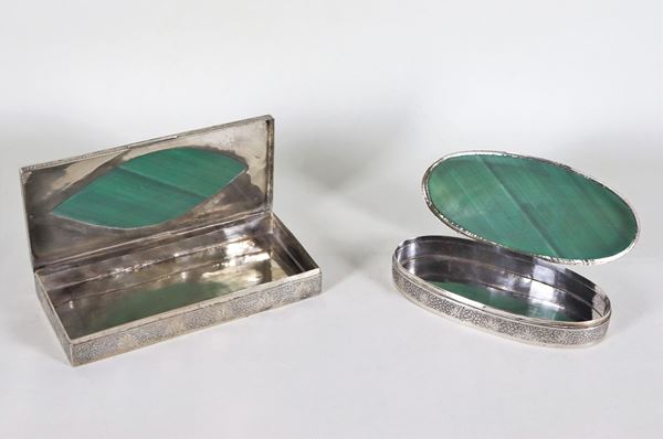 Lotto di due scatole in metallo argentato e cesellato, sui coperchi applicazioni a finta malachite
