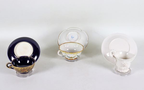 La tazza in porcellana bianca con decori floreali a rilievo presenta lievi difetti, la tazza in porcellana blu cobalto con decorazioni in oro a motivi orientali.