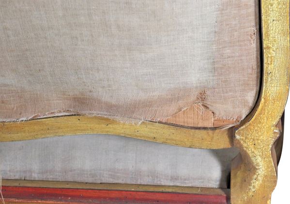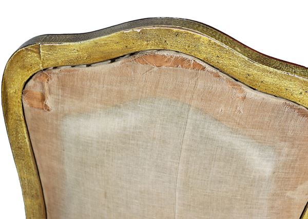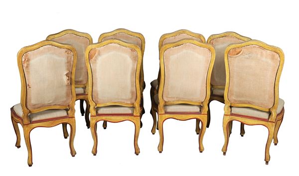 Lotto di otto sedie di linea Luigi XV in legno laccato con profili in rosso, schienali alti centinati e quattro gambe ricurve