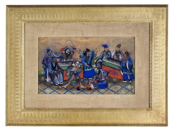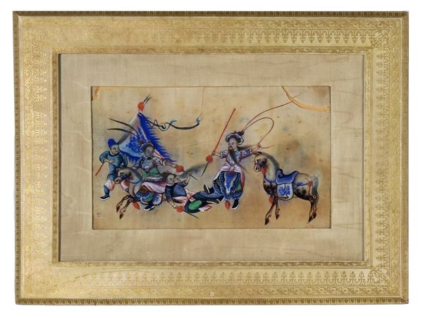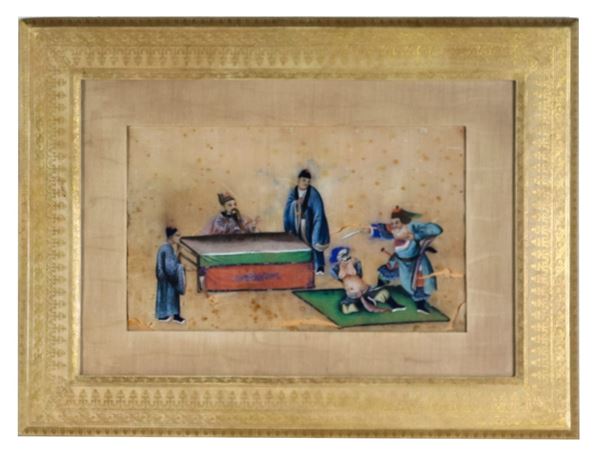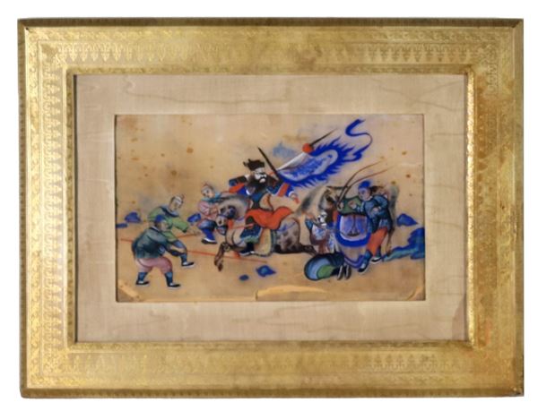 Lotto di quattro antichi dipinti cinesi su carta di riso "Scene di combattimento e torture"