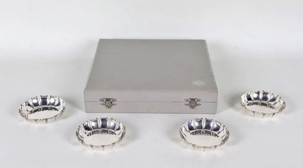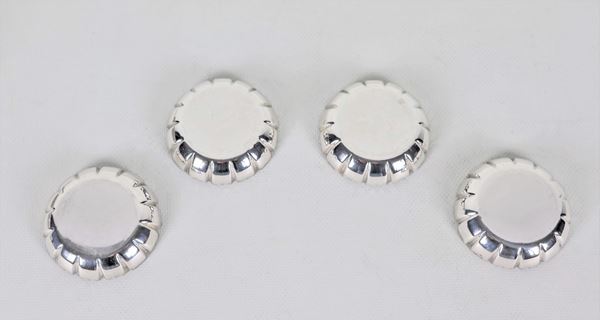 Lotto di quattro salierine in argento Sterling 925, a forma tonda con bordo frastagliato, gr. 160