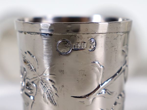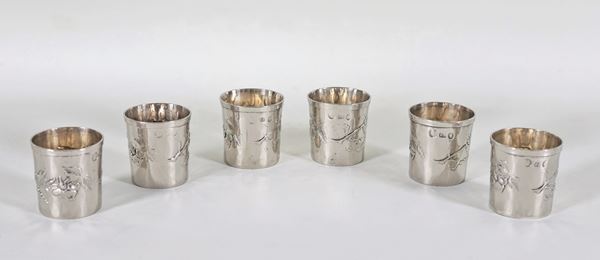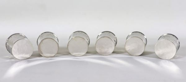 Lotto di sei bicchierini da liquore in metallo argentato con grappoli a rilievo