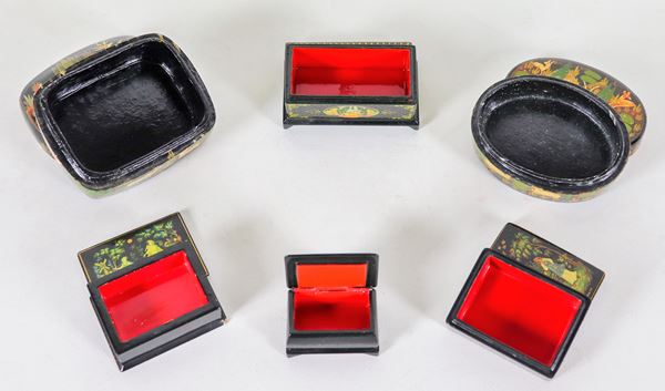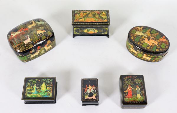 Lotto di sei scatole russe in legno laccato nero con decori variopinti a motivi di città, animali e figure femminili