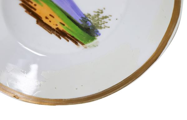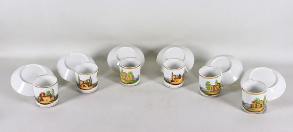 Lotto di sei tazze con piattini napoletane in porcellana, con decorazioni variopinte a motivi di paesaggi e profili in oro zecchino
