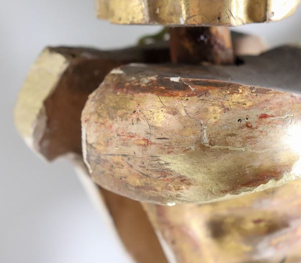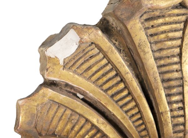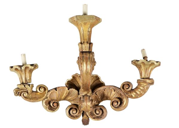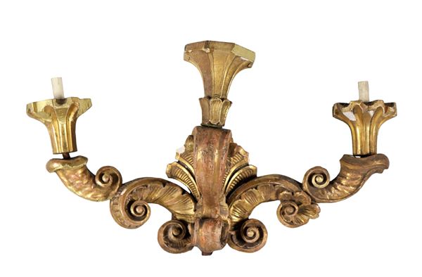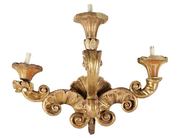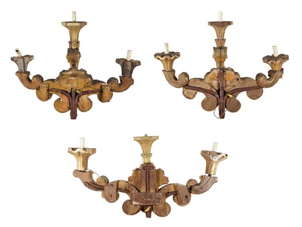 Lotto di tre antichi portaceri da muro, a tre bracci ciascuno, in legno dorato e intagliato a motivi Luigi XIV