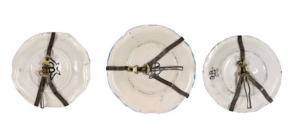 Lotto di tre piatti da muro in maiolica smaltata San Marco, con decorazioni variopinte a motivi di gondole, fiori gialli e neri e grappoli d' [..]