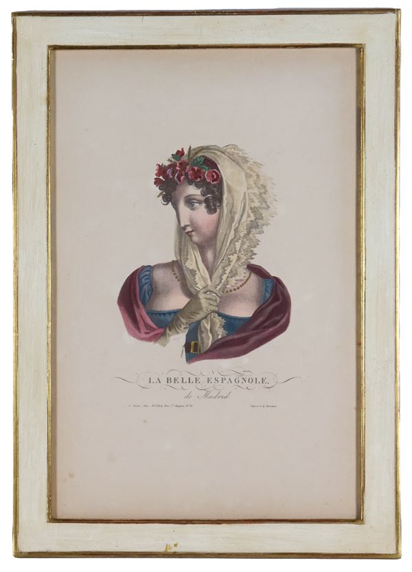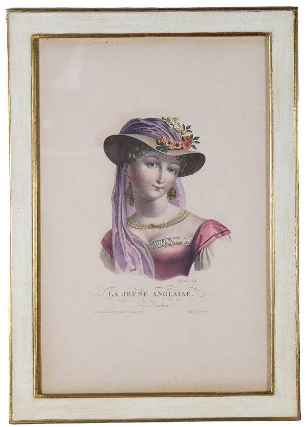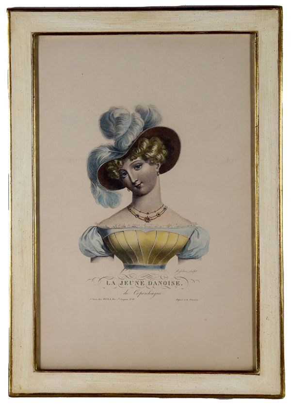 Lotto di tre stampe francesi a colori "La giovane ragazza inglese, spagnola e danese"