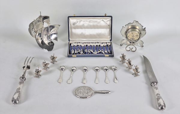 di 2 antiche posate per arrosto, 1 piccolo orologio da tavolo con sveglia, 1 piccolo veliero, 1 specchietto, 6 segnaposti, 6 cucchiaini da tè e 12 da caffè.