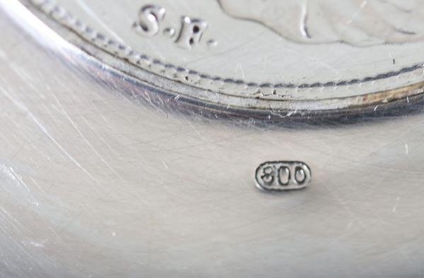 composto da: coppia di saliere Impero mancanti delle vaschette in cristallo, un boccalino, un tagliacarte, una salierina a forma di coppa, un piattino tondo e un' assaggiavino firmato Bulgari. Altezza massima cm 7.