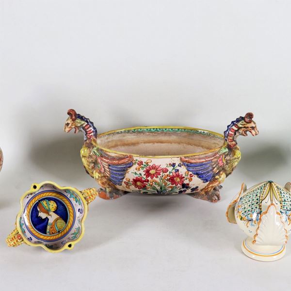 Lotto in maiolica italiana a varie decorazioni e policromie (5 pz)