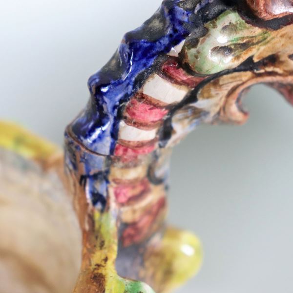 di un centro tavola ovale, un piccolo vaso con coperchio, una ciotola con manici, un piccolo vaso esagonale e un pumo di Grottaglie. Il centrotavola e il vaso con coperchio presentano difetti e mancanze. Misura massima cm 35 x 14 x 17 h.