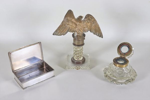 Lotto in metallo argentato, bronzo e cristallo di un fermacarte a colonna con aquila sovrastante, un calamaio e una scatola portasigarette (3 [..]
