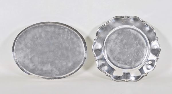 Lotto in metallo argentato, sbalzato e cesellato di un piatto tondo da dolce e un piccolo vassoio ovale (2 pz)