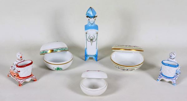 di tre scatoline tonde, un flacone quadrato e due salierine a forma di cinesini. Altezza massima cm 18.