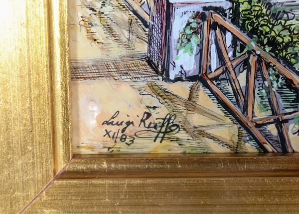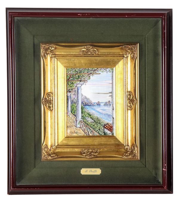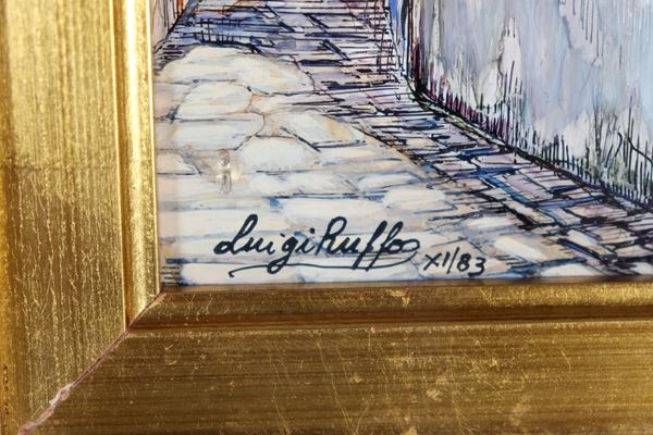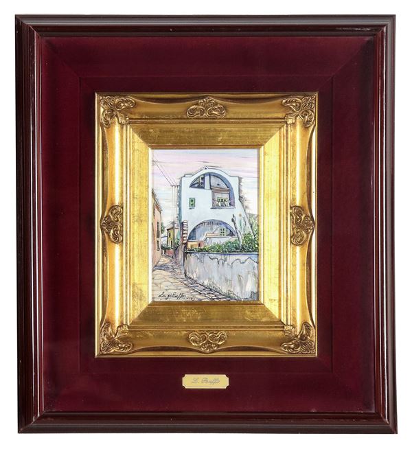 Firmate e datate 1983. "I Faraglioni a Capri" e "Stradina di Procida", coppia di piccole lastre in argento puro dipinte a tecnica mista