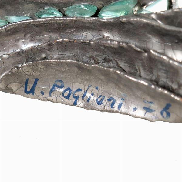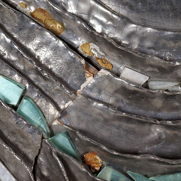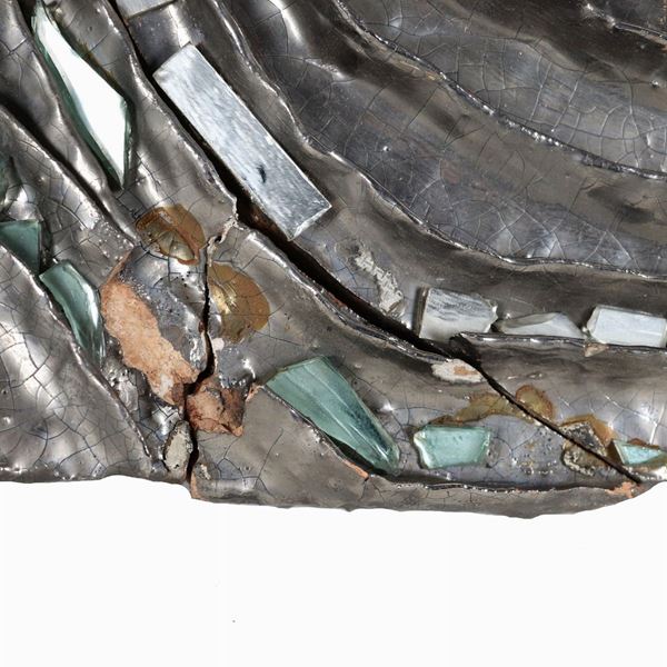 Firmata e datata 1976. "Onde", scultura astratta in ceramica corrugata e argentata con frammenti in vetro