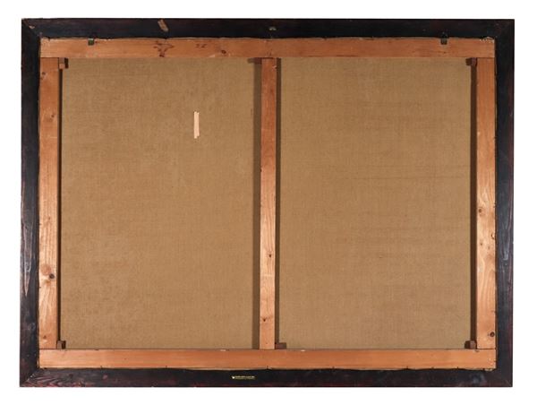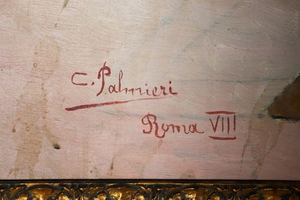Firmato ed iscritto Roma. "Giocatori di carte nel salotto settecentesco", grande dipinto ad olio su tela